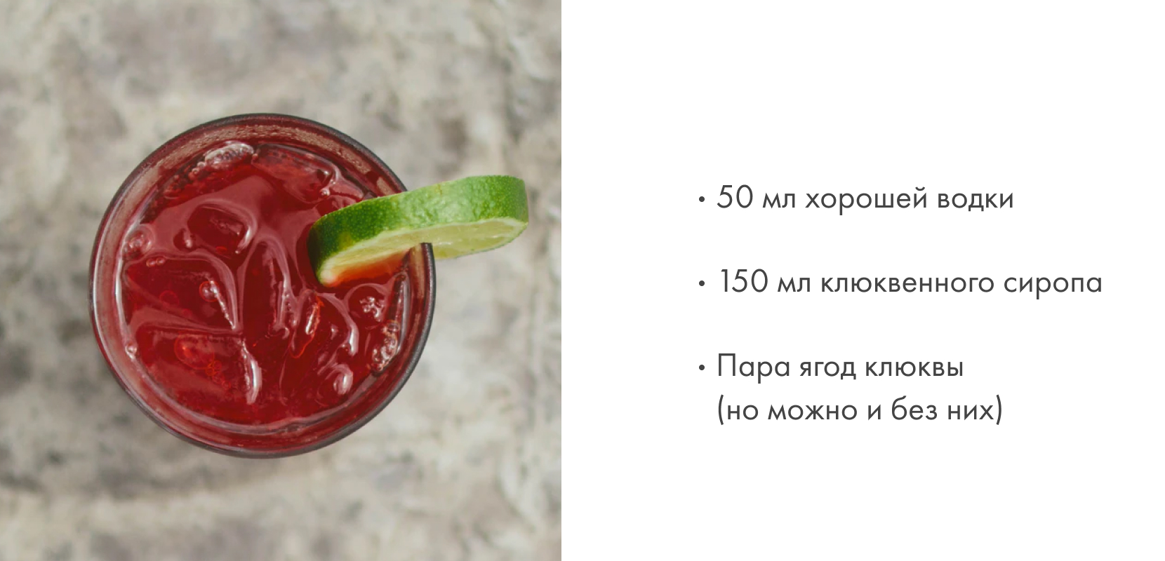 | | | | В высокий бокал насыпаем лёд, затем наливаем водку и клюквенный морс до самого верха. Перемешать — готово!