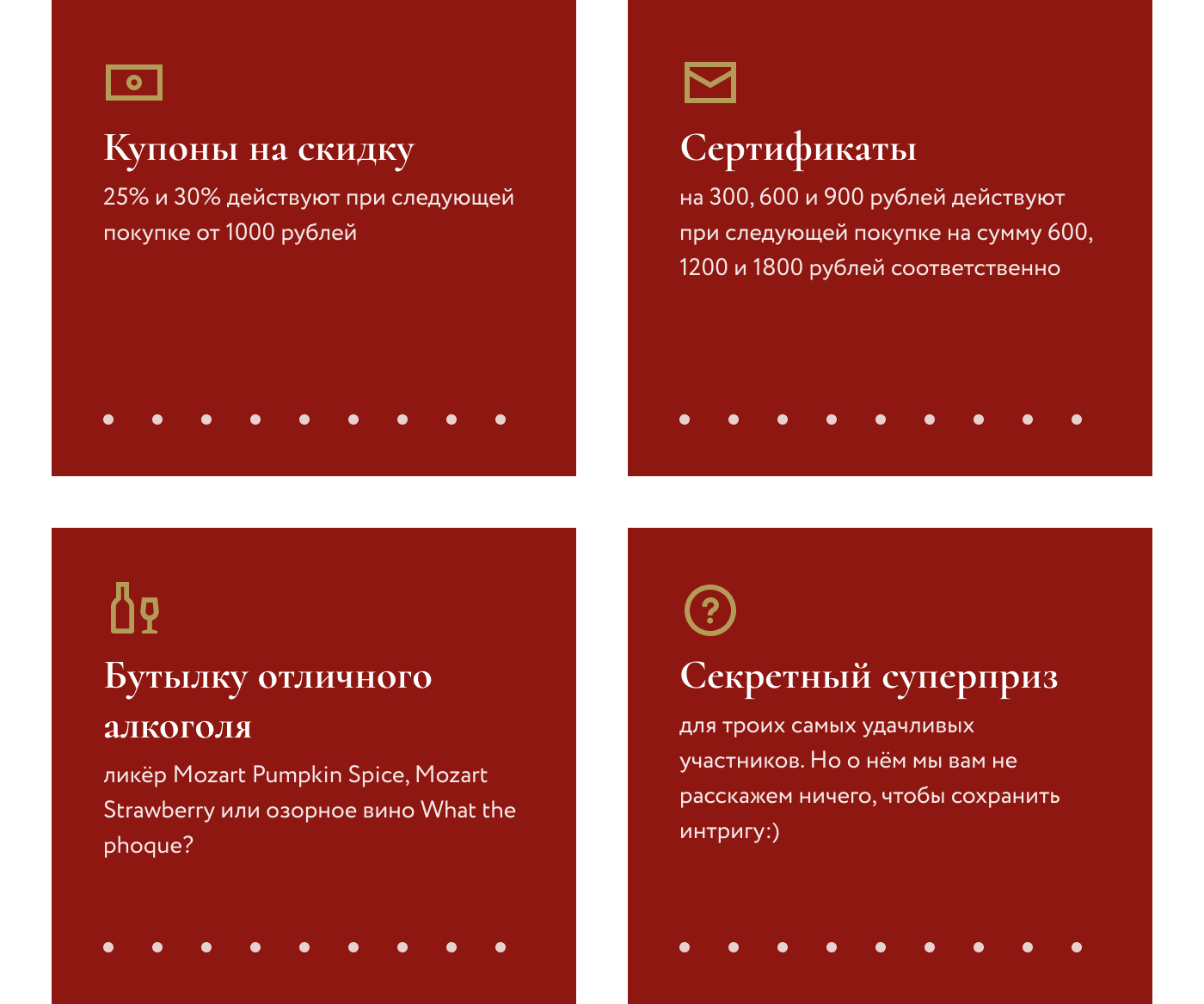 Условия проще, чем повесить шарик на ветку: • вы делаете покупку на сумму от 3 000 рублей и вытягиваете билетик; • получаете либо купон на скидку, либо сертификат, либо один из призов, суперприз.