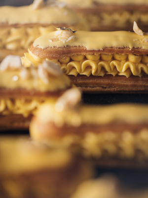 На противень, застеленный бумагой для выпечки, выложить 14 эклеров одинаковой длины. Посыпать тесто сахарной пудрой. Уменьшите температуру духовки до 170°C и выпекайте эклеры в течение 40 минут. Первые 30 минут дверцу духовки лучше не открывать. Оставьте эклеры остывать на противне.